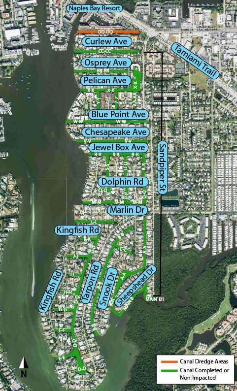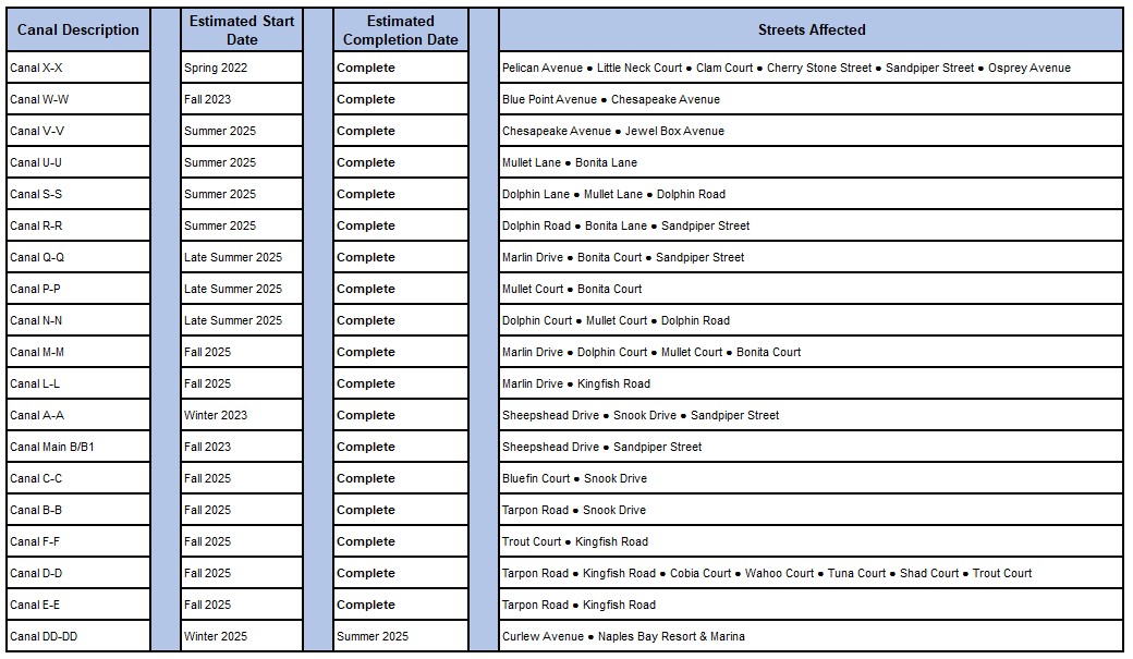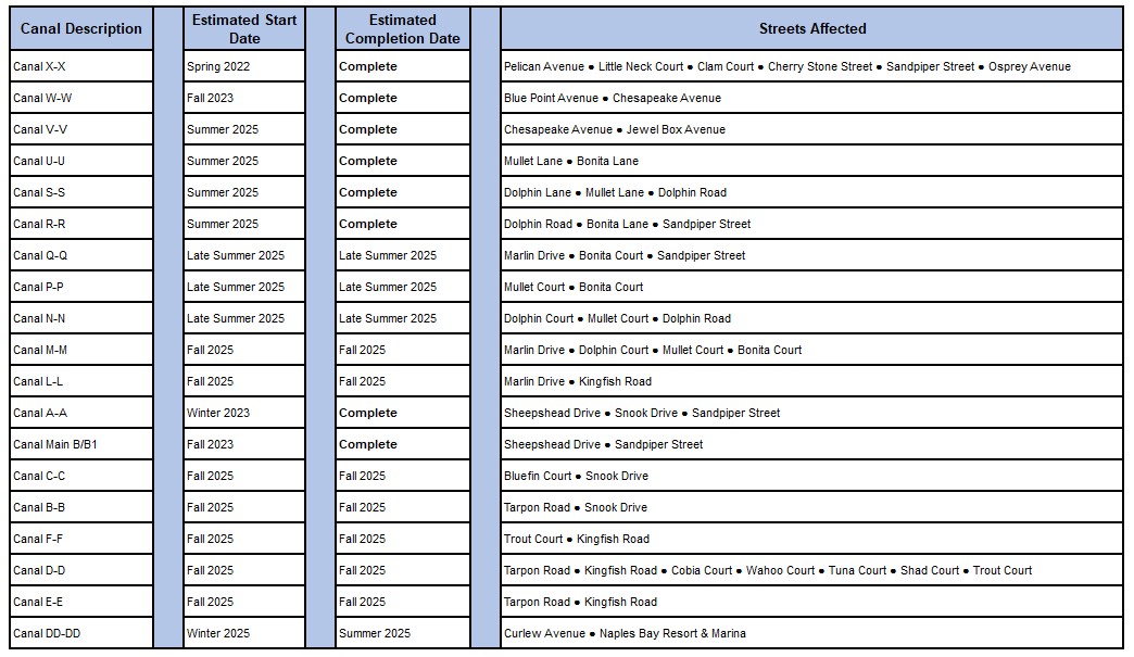 The contractor, Quality Enterprises, expects to begin in the northern canals near the Naples Bay Resort and generally progress south. Crews will work in one canal at a time, with work starting at the far end of the canal and progressing outward towards the bay. Dredging timeframes will vary depending on the length of the canal and the amount of dredging, both project related and privately contracted, in each canal. The city-contracted dredging is expected to be completed by mid-2026.